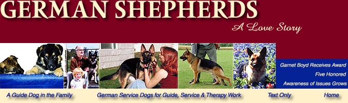 Three dogs - Peyton, Ava, and Watson - all German Shepherds, all entrusted with the same noble case...to serve and protect. To bring freedom to my father by giving him the precious gift of independence through mobility. These days, in Oakville, where I live, I often see guide dogs with their trainers or new masters working along the sidewalks as part of the Lions' Club guide dog center. I watch the dogs carefully, noting and judging them with knowledge learned long ago but not forgotten. I watch the trainers walking behind, aware that they will fail any dog that does not or cannot make the grade. I see blind men and women, harness gripped in hand, making that leap of faith and trusting their dogs to guide them safely through the intersection of a busy city. I make that leap of faith with them. For my father and for me. |